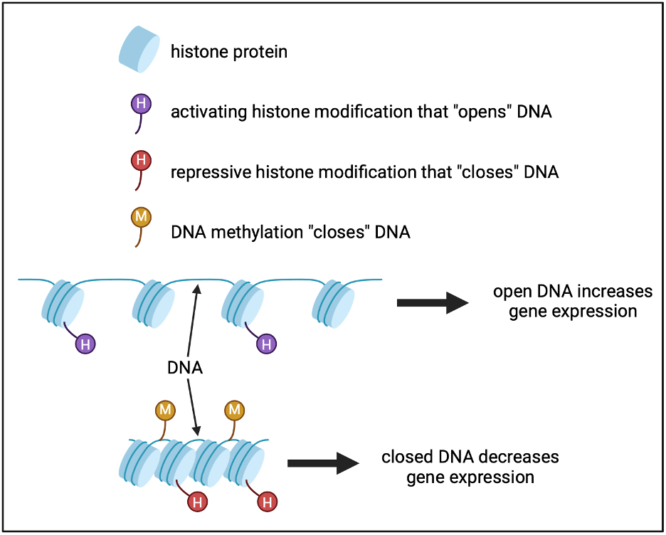 Differences in genetic code are known to cause variations in human appearance, disease susceptibility, behavior, and as previously mentioned, immune response. However, Aracena and colleagues show that a lesser studied, but highly important, piece of the puzzle, known as epigenetic variation, also contributes to each individual’s unique immune responses to flu infection. The term epigenetics literally means “above the genetics,” and refers to chemical marks that do not change the genetic code itself, but rather alter how the genetic code is utilized by the cell. These chemical marks can be found directly on DNA, such as DNA methylation, which is when a carbon atom is directly bound to DNA. Epigenetic marks can also be found on histones, the proteins that DNA wraps around to organize it into chromosomes. The function of epigenetic marks is to alter DNA accessibility, meaning they “open” or “close” the DNA. Genes with activating epigenetic marks open DNA and increase gene expression, while genes with repressive marks close DNA and decrease gene expression.
