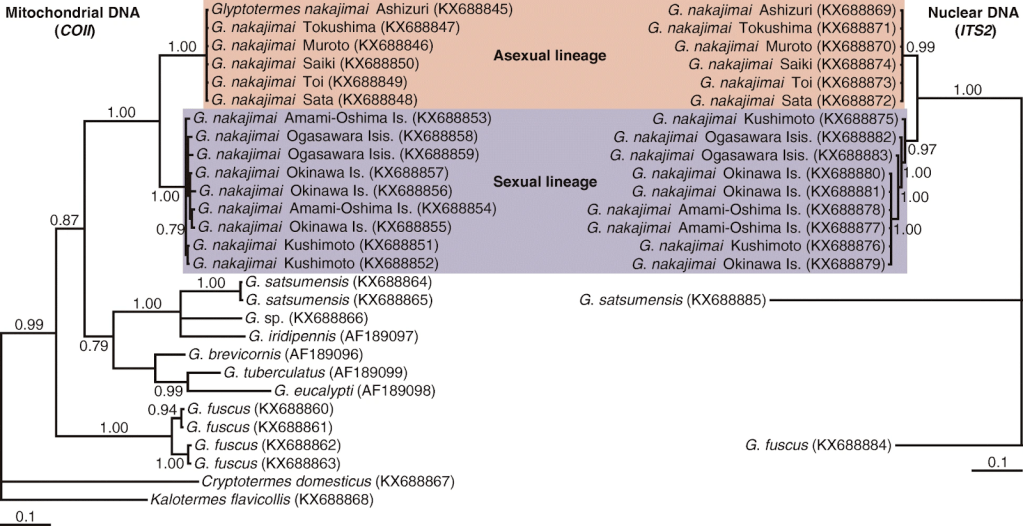 Figure 4 from Yahshiro et al., licensed under Creative Commons Attribution 4.0 International License. This pair of phylogenetic trees shows the clustering of asexual and sexual termite lineages, indicating that the two lineages are genetically distinct and diverged from a common ancestor.